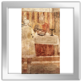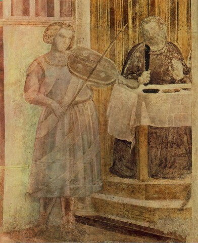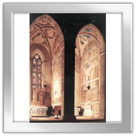 Росписи капеллы Перуцци. Строительство капеллы Перуцци, второй капеллы правого трансепта, стало возможным благодаря влиятельному банкиру, Донато ди Арнольдо Перуцци, который оставил деньги для создания капеллы в его честь в 1299. Вероятно, его внук Джованни ди Риньери Перуцци (Giovanni di Rinieri Peruzzi) заказал в этой капелле фресковые росписи, прославляющие житие Иоанна Богослова и Иоанна Крестителя, которые стали первыми настенными росписями Джотто в Санта-Кроче. Сопоставление двух циклов жития святых является необычным, и исследователи считают, что они содержат смесь религиозной и светской иконографии. Роспись капеллы Перуцци, выполнена почти исключительно в технике альсекко. Компоновка эпизодов, необыкновенно монументальных по своему строю, демонстрирует расцвет творческих сил художника, здесь можно провести аналогию с росписями Джотто в Нижней церкви в Ассизи. Поверхность стен в капелле Перуцци больше, что позволило использовать более сложные сочетания фигур, чем в падуанских настенных росписях. Пространство этих монументальных фресок глубже и просторнее, в них словно больше воздуха.