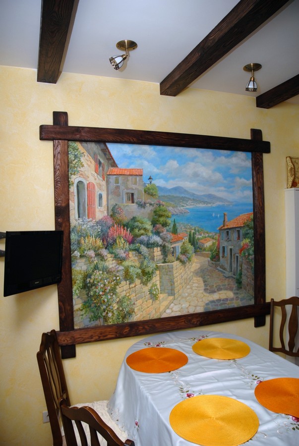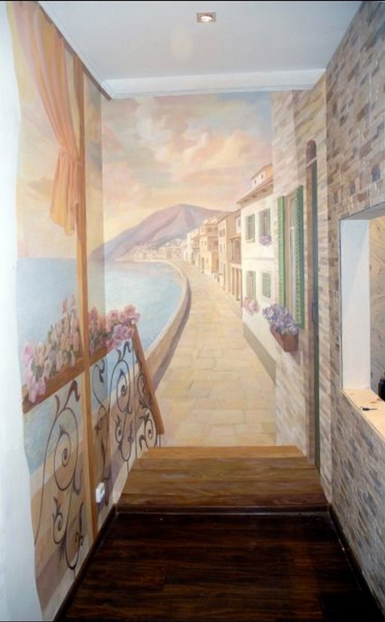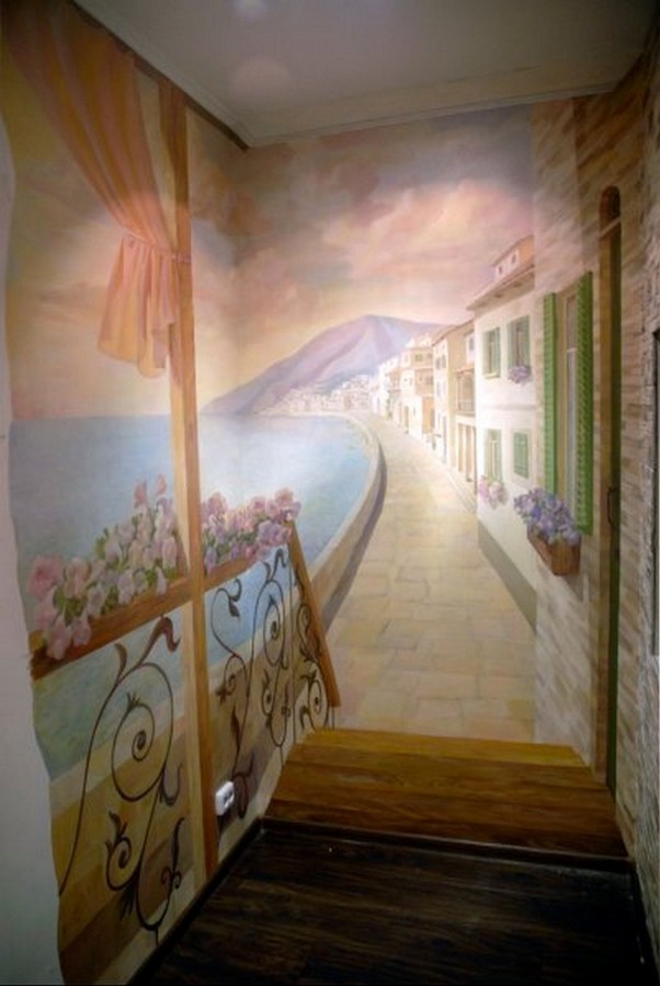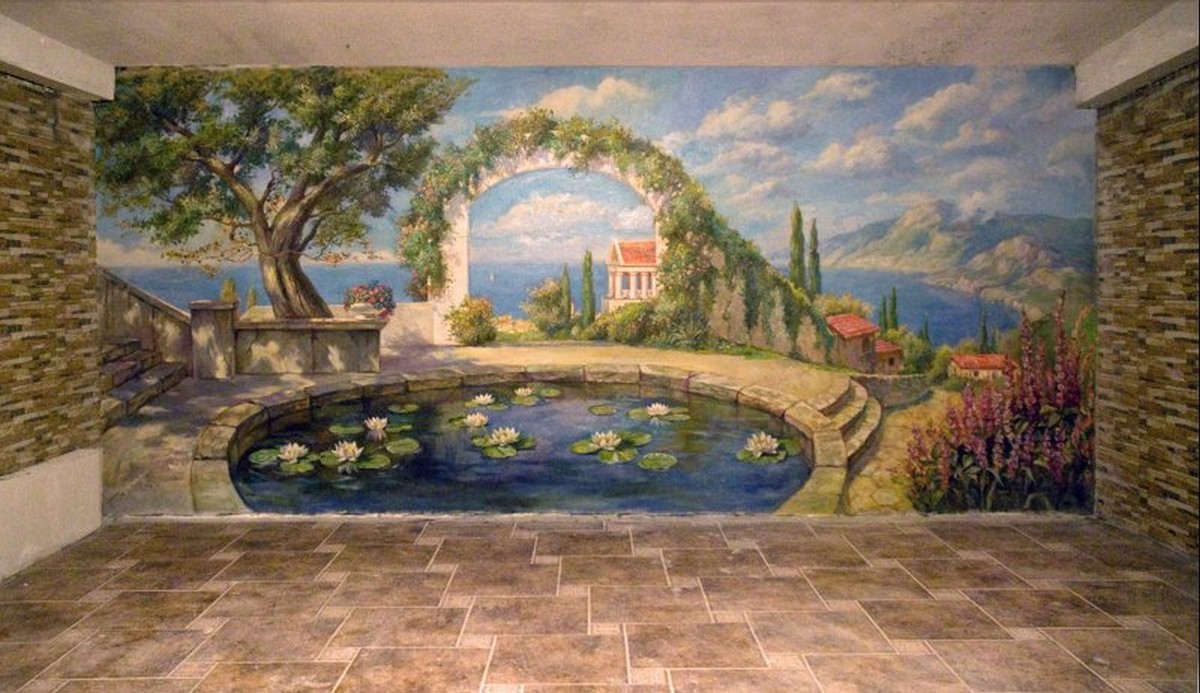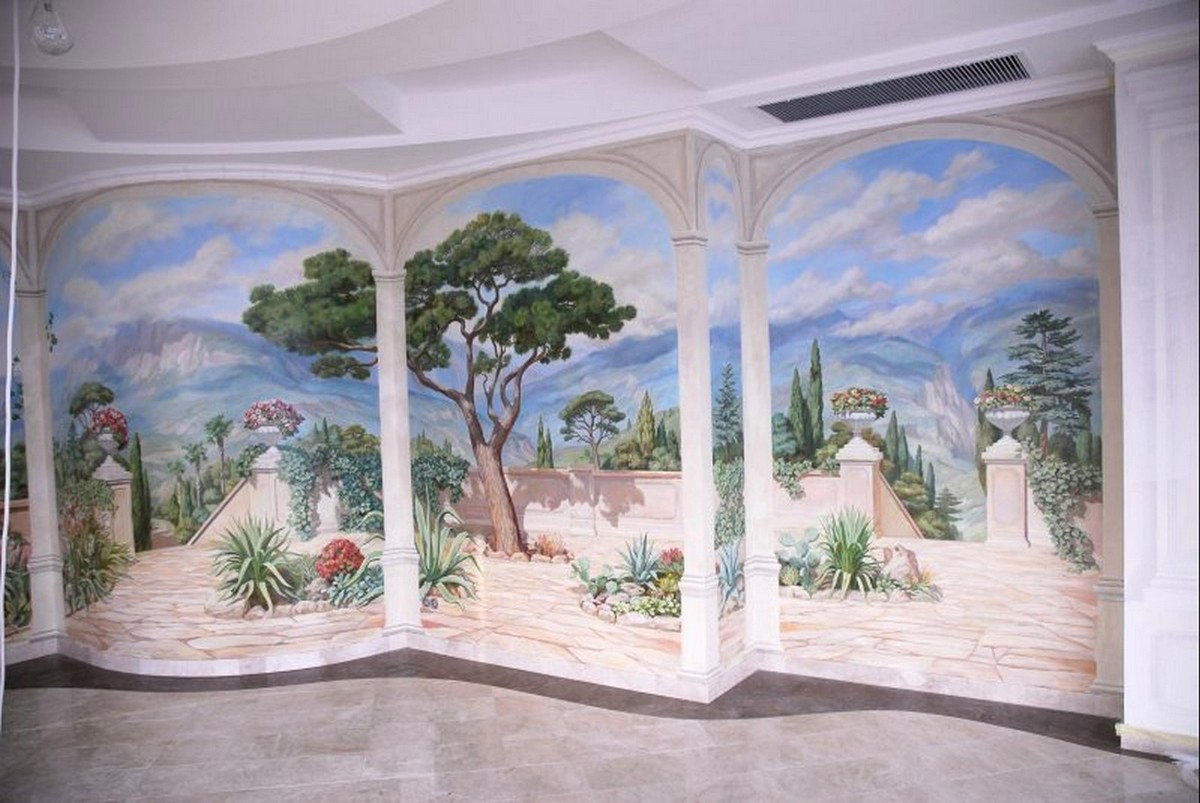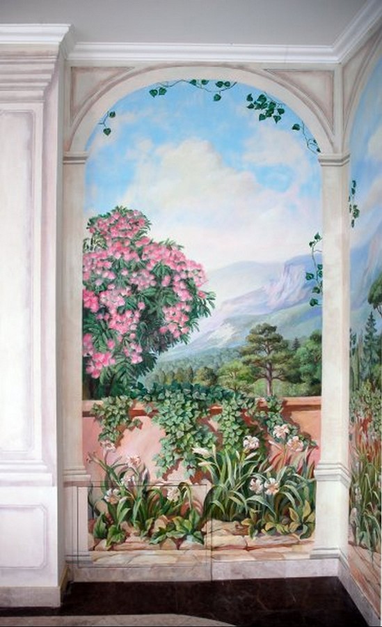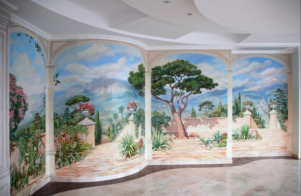 Настенная фреска, фальшь–окно, альфрейная живопись, роспись потолков, витые орнаменты, украшающие стены и мебель, художественная роспись стен, всегда помогали предать изысканость интерьеру, подчеркнуть его уникальность и стиль. Сочетая живописное и реальное пространство, можно достигнуть эффекта увеличения помещения. Например, если необходимо создать иллюзию открытого пространства стену можно украсить многоплановым пейзажем, изображением горных ландшафтов и морских просторов. Порой эффект иллюзии может быть так велик, что тяжело сразу осознать реальные размеры помещения.